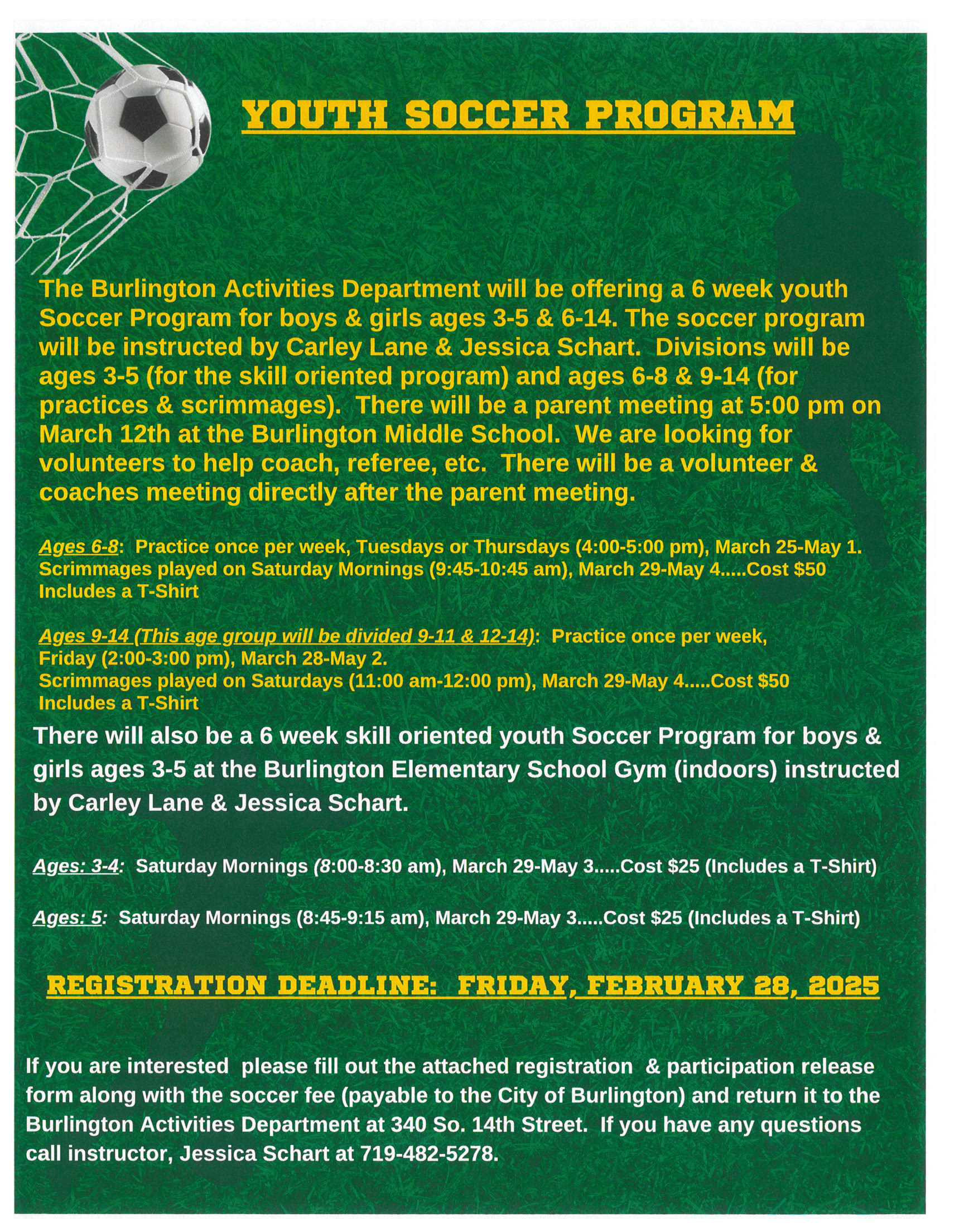 Burlington Activities Department offers a Youth Soccer for ages 3-14 at the Burlington Elementary School gym.
