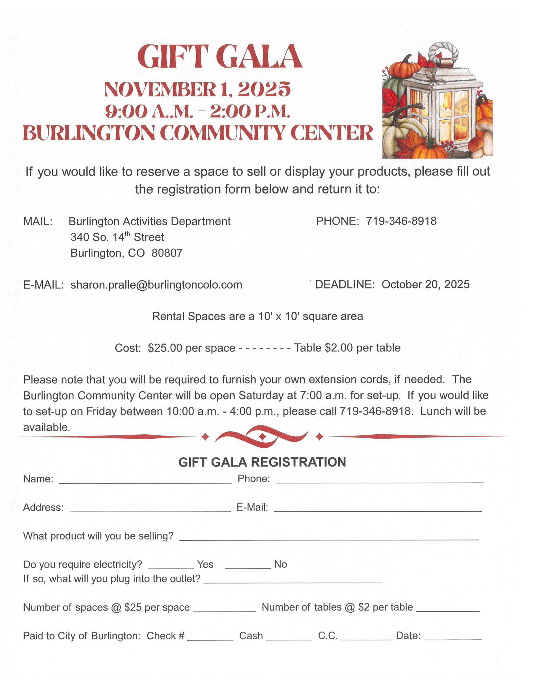 If you'd like to register for space at this year's Gift Gala to sell or display your products, please complete the registration form below and return it, with fees, to the Burlington Activities Department.
